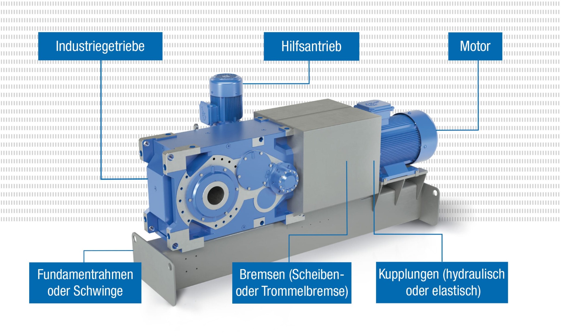 - Optimal aufeinander abgestimmte Komponenten (Getriebe, Motor, Frequenzumrichter, Kupplungen, Bremsen)